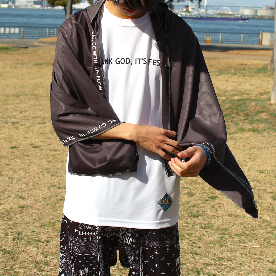 TGIF!のオリジナルデザインは背中中央に「神様ありがとう、今日はフェスです。」ロゴを配置。